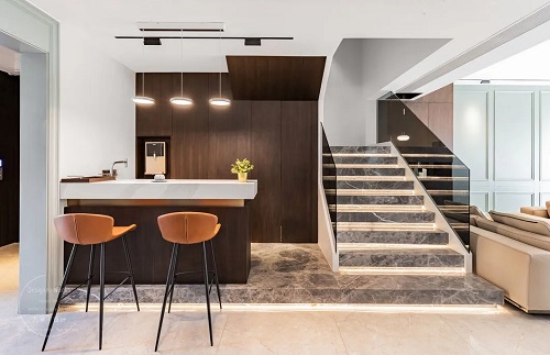 灯线可以营造餐厅的用餐氛围,暖黄的灯光让空间更温馨浪漫。若是有卡座,可将灯线沿顶部安装,让光像瀑布一样洒下来。若空间有柱体,也可以利用柱体嵌入灯线,与餐厅吊灯形成呼应。