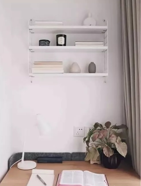 墙面装几个隔板架,还是非常好看的,只是,别装太多,多了你打扫卫生费劲。千万别在隔板上放绿植,你会完全忘记浇水的。还有,隔板架通常都是膨胀螺丝固定,其实就是自攻螺丝+膨胀管,本身质量不怎么样,再加上开发商的墙体也不怎么样,承重效果很差。放书不行,因为书真的太重了, 隔板架根本承受不住,只能放轻便的画框和小装饰物。