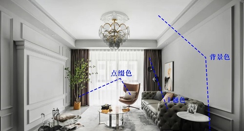 背景色(墙顶地的颜色)70%+主题色(墙顶地的颜色)20%+点缀色(配饰的颜色)10%